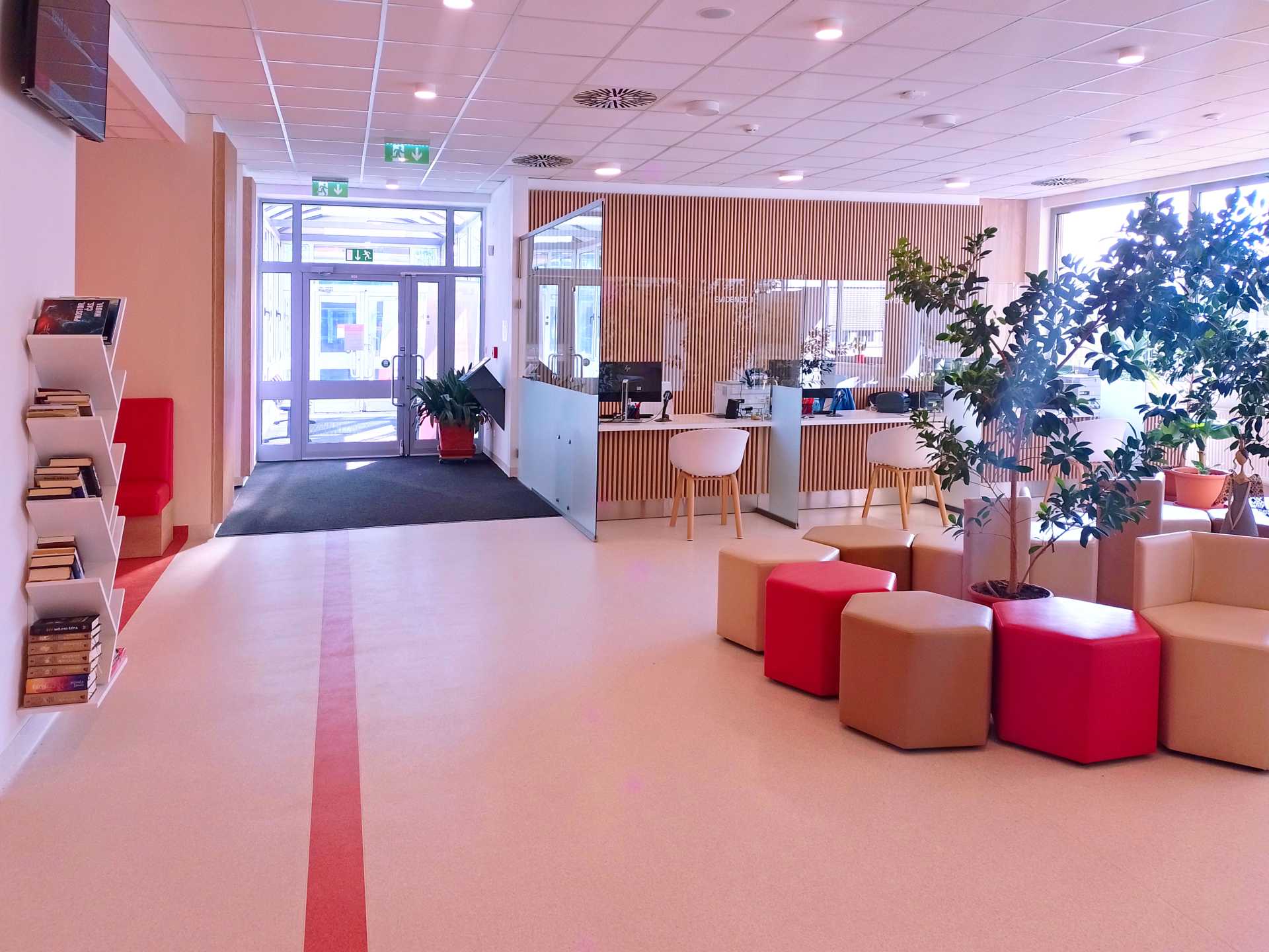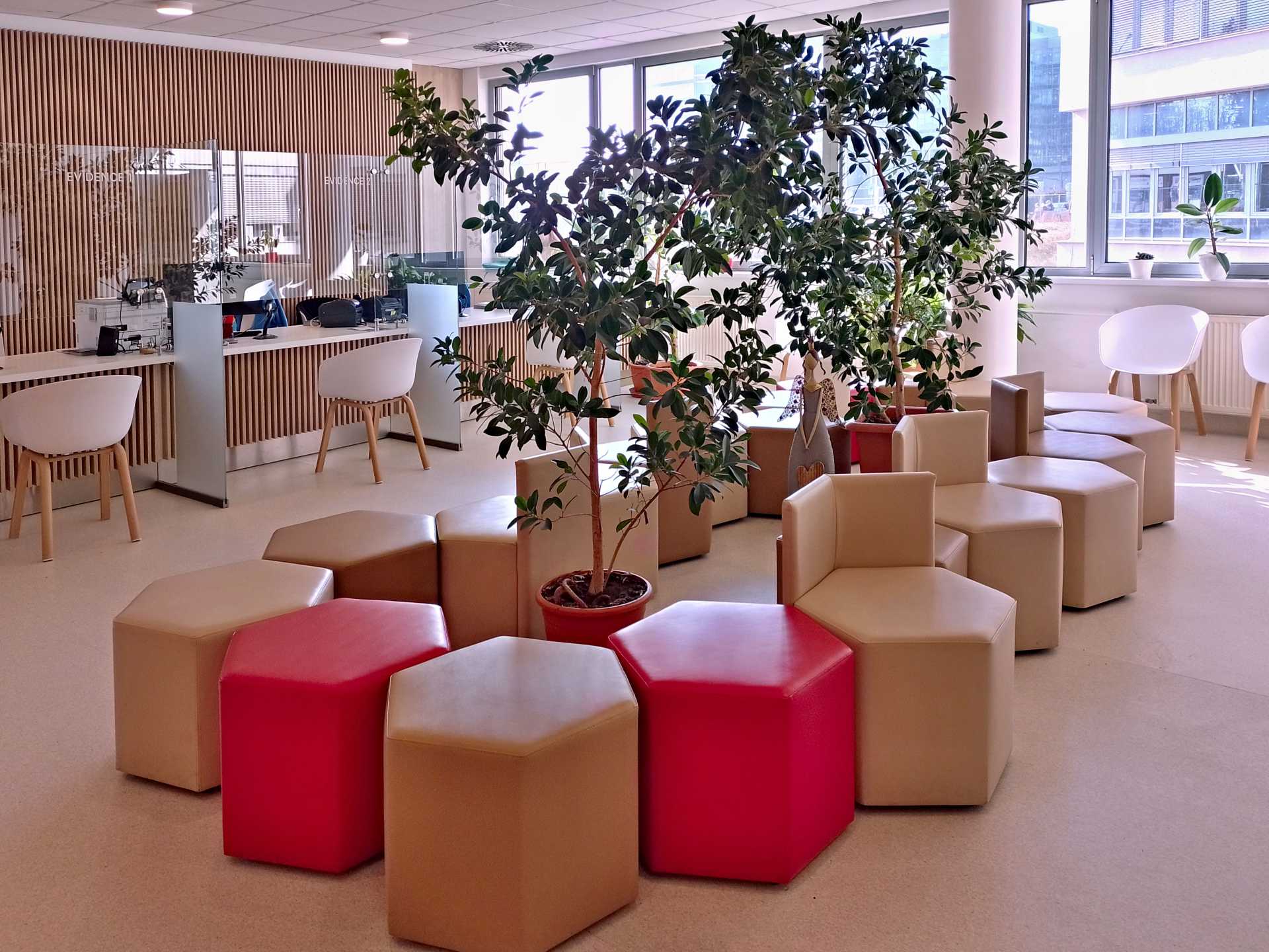 Při prohlídce Transfuzního a tkáňového oddělení budeme sledovat cestu krve od příchodu dárce na ddělení přes samotný odběr až po výrobu, sklad a expedici. Prohlídku zahájíme v hale dárců, která prošla v roce 2025 rozsáhlou rekonstrukcí, díky níž poskytuje komfortní zázemí pro registraci dárců krve, elektronické vyplnění formulářů, občerstvení i šatnu. Interiér je laděn do červeno-bílých barev s centrální červenou podlahovou linií, která opticky směřuje dárce do místnosti, v níž se odebírají vzorky krve, a na vyšetřovnu. Cesta dárce dále pokračuje na odběrový sál. Zde probíhají odběry plné krve a také přístrojové odběry plazmy a krevních destiček. Následně postoupíme do úseku výroby, kde se krev zpracovává na jednotlivé složky, a prohlídku zakončíme v expedici, kde se nachází sklad všech transfuzních přípravků, odtud jsou expedovány na jednotlivé kliniky.