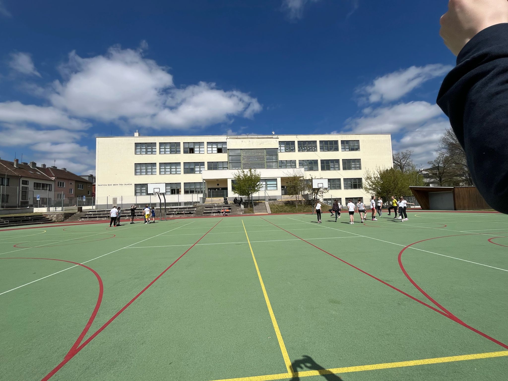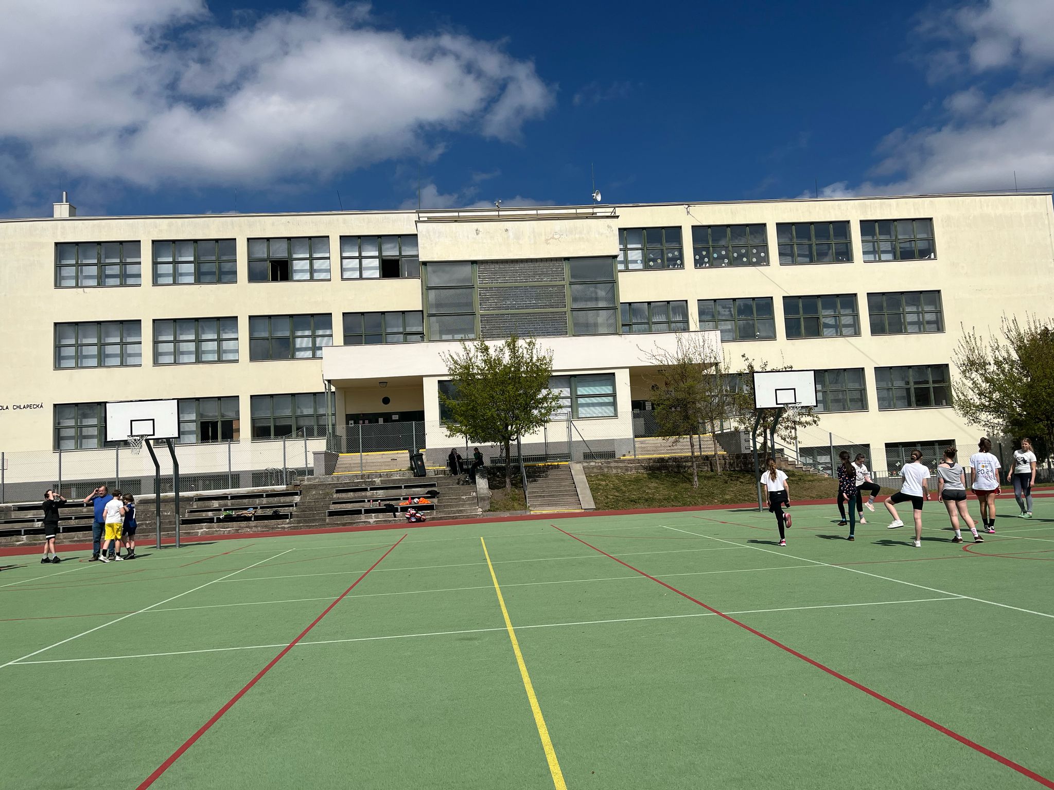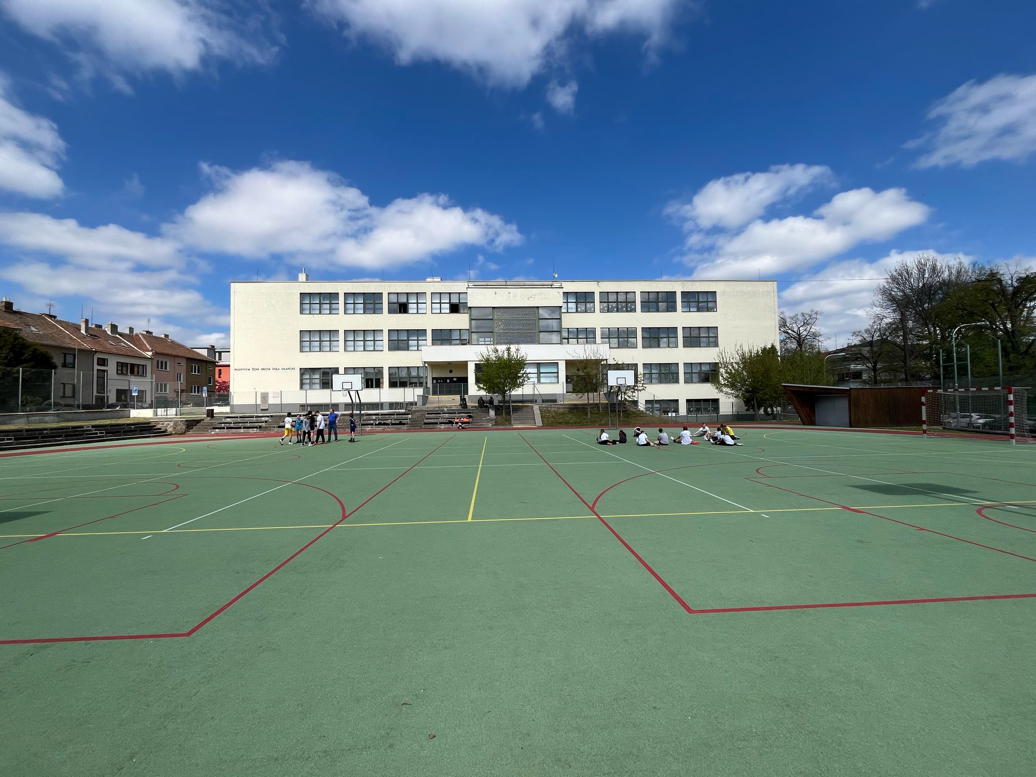 Hmotová kompozice je založena na dvou kolmých křídlech s plochými střechami. Hlavní podélné křídlo podél ulice Zemědělská doplňuje nižší příčné křídlo s rizalitem směrem k ulici, kde jsou umístěny sdílené provozy. Vstupy do školy jsou symetricky umístěny po stranách tohoto rizalitu a fasáda díky členění vytváří ikonickou kompozici ve tvaru kříže.