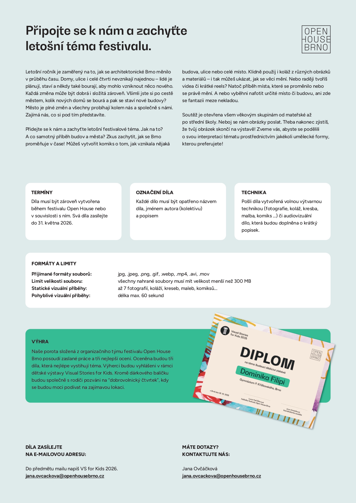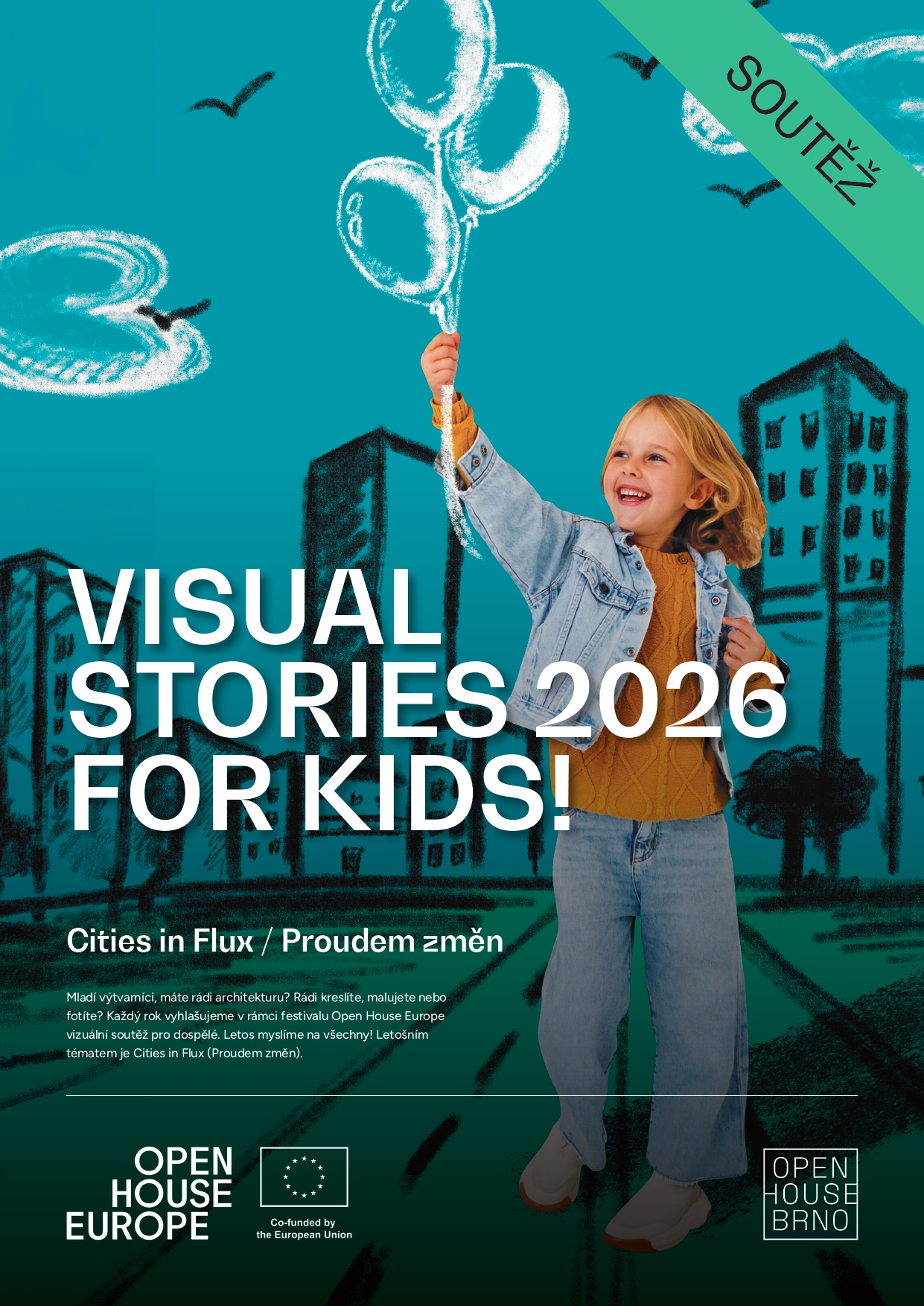 Mladí výtvarníci, máte rádi architekturu? Rádi kreslíte, malujete nebo fotíte? Každý rok vyhlašujeme v rámci festivalu Open House Europe vizuální soutěž pro dospělé. Letos myslíme na všechny! Letošním tématem je Cities in Flux (Proudem změn). Připojte se k nám a zachyťte letošní téma festivalu. Letošní ročník je zaměřený na to, jak se architektonické Brno měnilo v průběhu času. Domy, ulice i celé čtvrti nevznikají najednou – lidé je plánují, staví a někdy také bourají, aby mohlo vzniknout něco nového. Každá změna může být dobrá i složitá zároveň. Všimli jste si po cestě městem, kolik nových domů se bourá a pak se staví nové budovy? Město je plné změn a všechny probíhají kolem nás a společně s námi. Zajímá nás, co si pod tím představíte.
