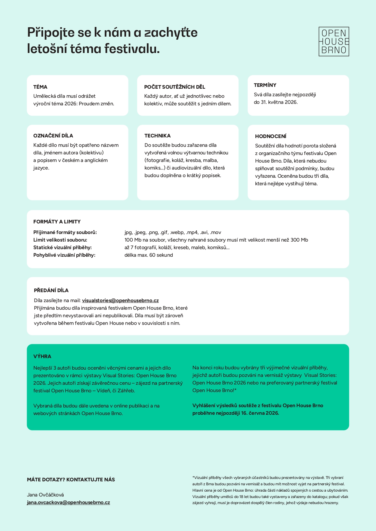 V případě dotazů můžete kontaktovat Janu Ovčáčkovou na emailové adrese jana.ovcackova@openhousebrno.cz